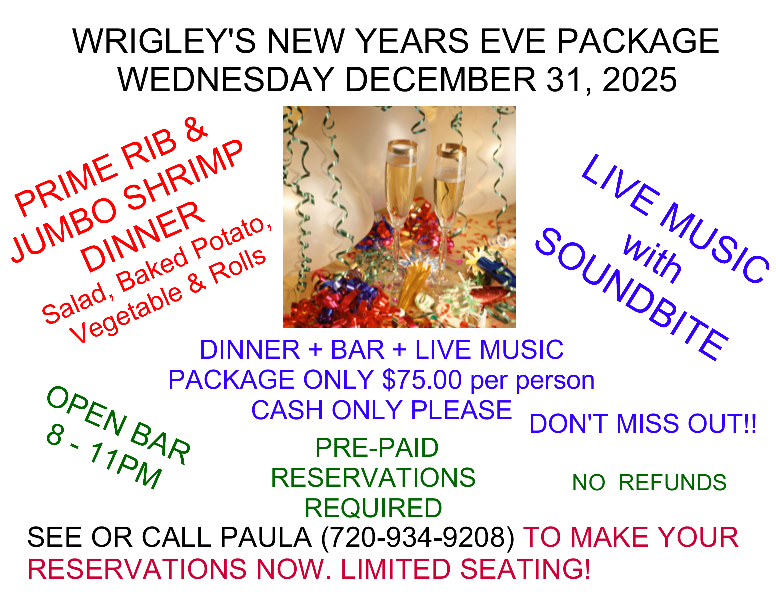 BEST NEW YEARS EVE PACKAGE!! STEAK & SHRIMP COMPLETE DINNER, OPEN BAR, CHAMPAGNE TOAST AND LIVE MUSIC. BUY YOUR RESERVATION NOW. CALL PAULA AT 720-934-9208